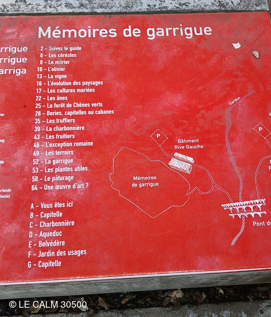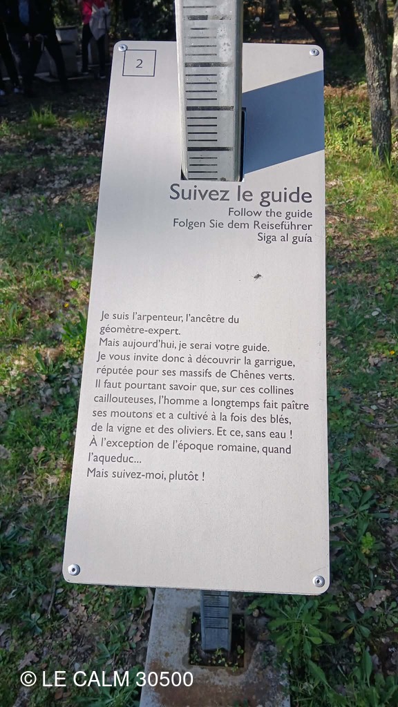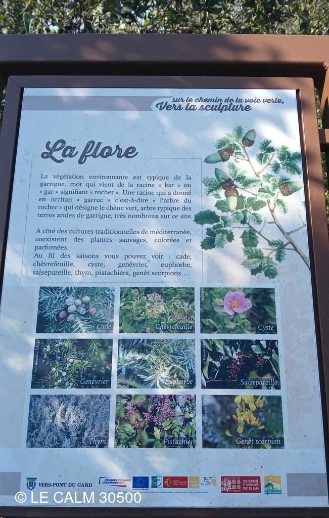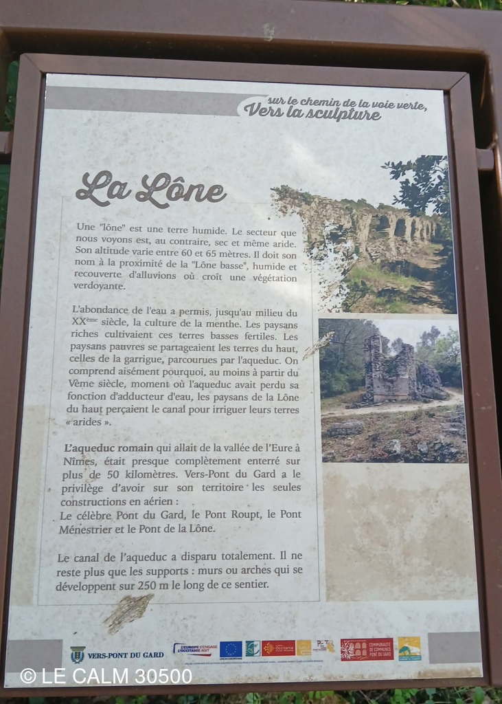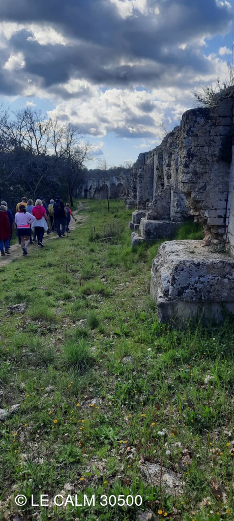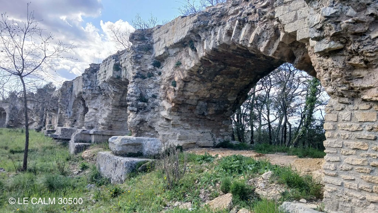 Dès la sortie du village , nous abordons un joli chemin dans une garrigue verdoyante qui nous permet de longer cet aqueduc romain d'une cinquantaine de km , conduisant l'eau d'UZES à NIMES , du moins ce qu'il en reste car le temps et la récupération des pierres ont détruit une bonne partie de ces vestiges.