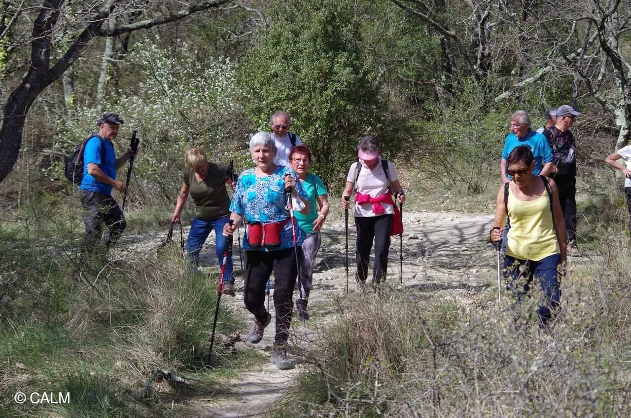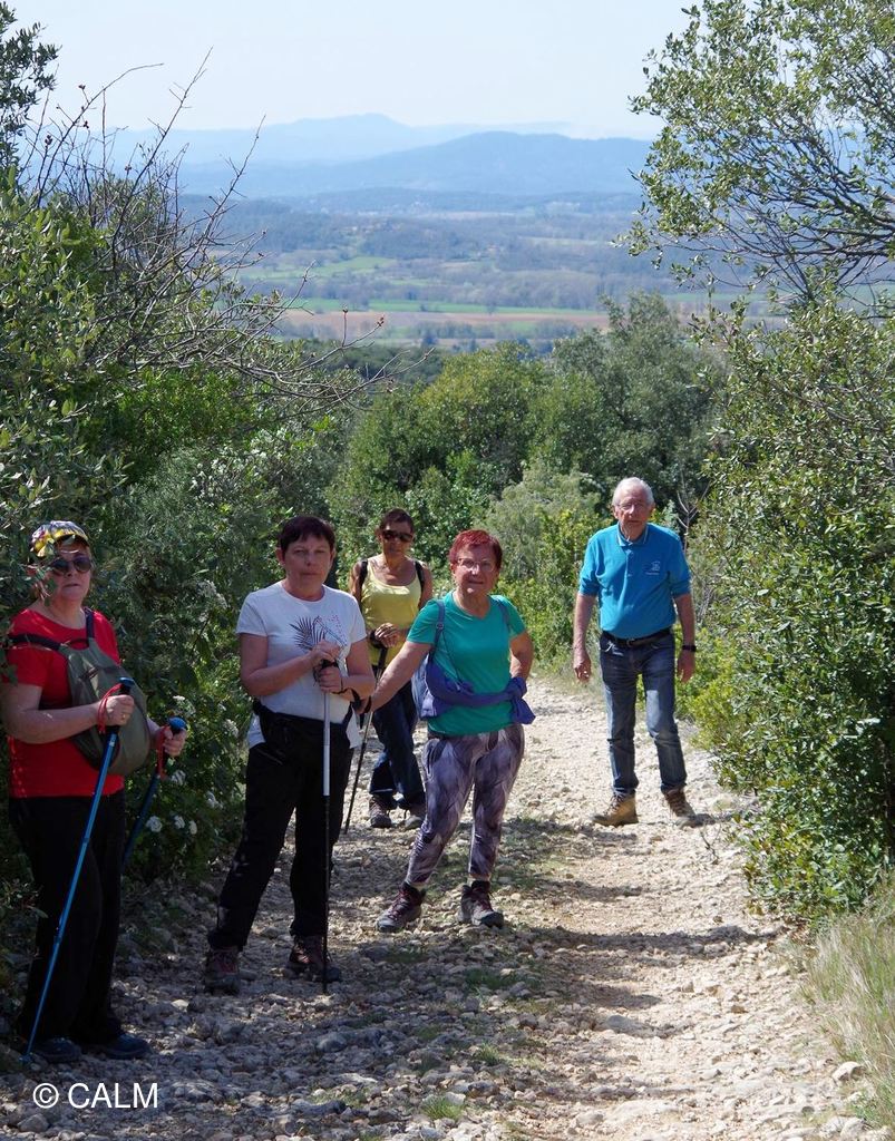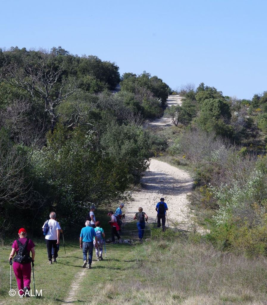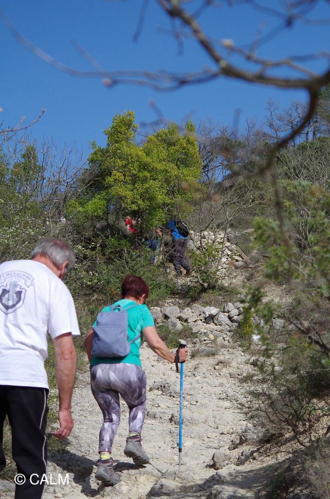 Nous partons du petit hameau du Cal sous un ciel bleu resplendissant et attaquons au départ par le lit de la rivière asséchée. Puis nous continuons notre bonhomme de chemin à travers bois, la montée est longue et le dénivelé de 260m se fait bien sentir dans les mollets. Les fleurs de printemps sont toujours là et égayent notre parcours. En hauteur nous pouvons apercevoir le château d'Allègre ou Castrum ainsi que la chapelle. La plus grosse partie du chemin est en pente douce mais, les cinq cents derniers mètres sont particulièrement pentus.