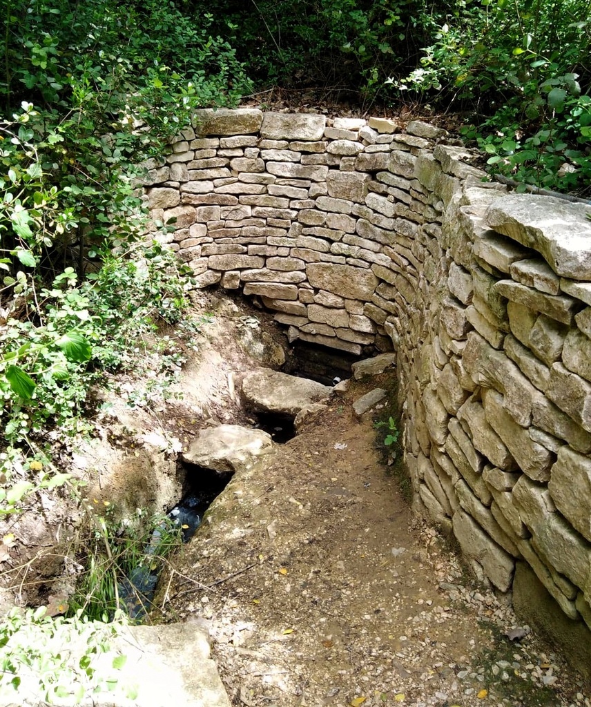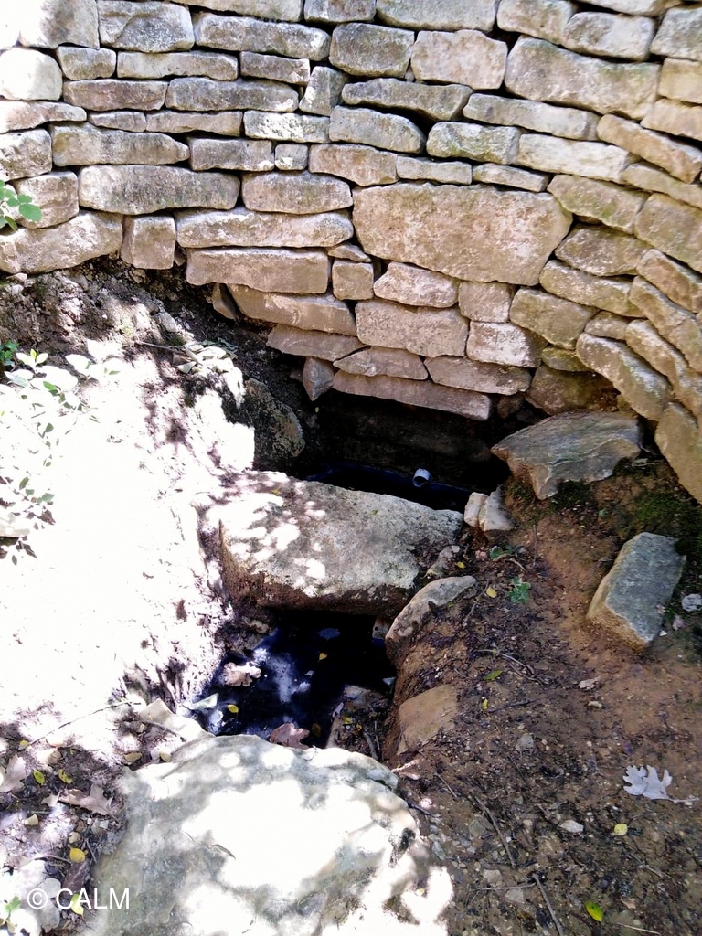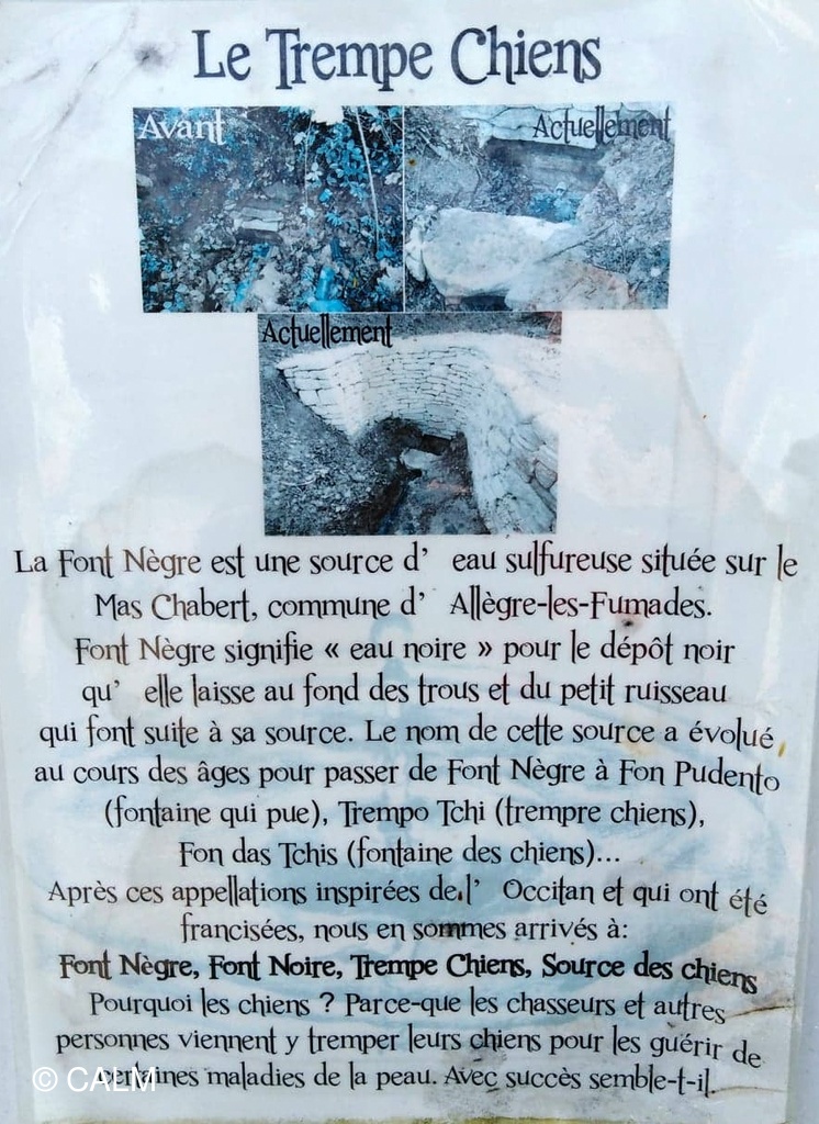 Nous passons devant le temple et nous dirigeons vers Valèzes. Après un long moment en sous bois et à travers vignes nous arrivons à la source. L'endroit a été joliment restauré, mais l'odeur de soufre est très persistante. La couleur de l'eau provenant de celle-ci n'est pas très engageante, même si elle est réputée pour soigner les petits bobos de peau.