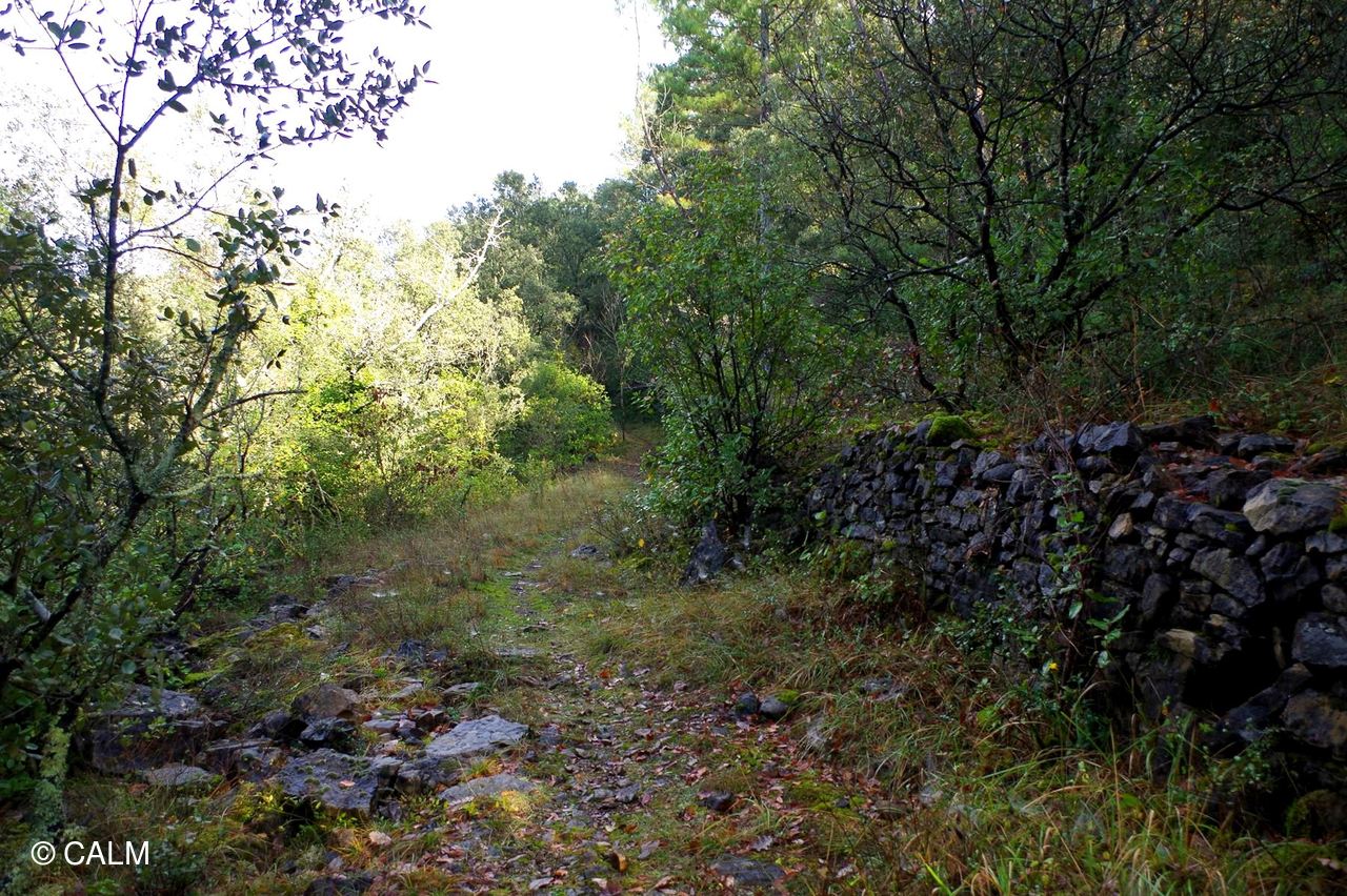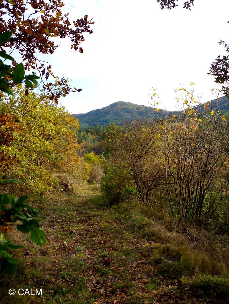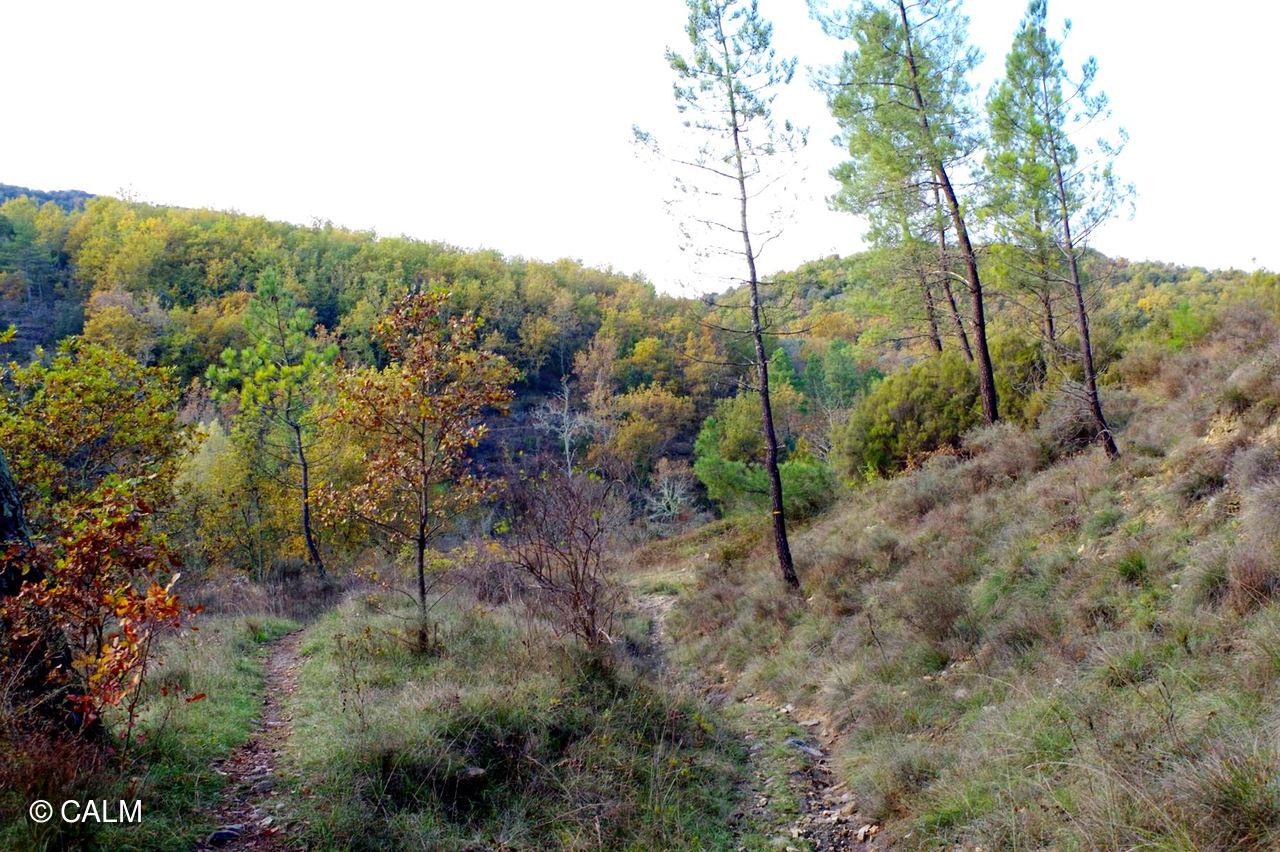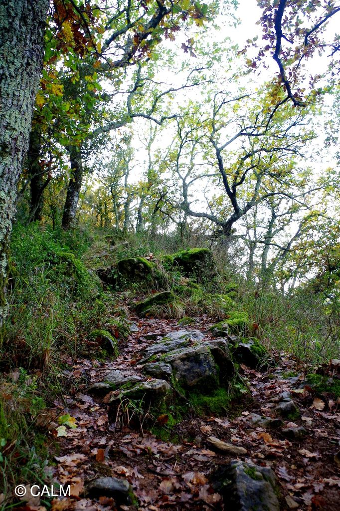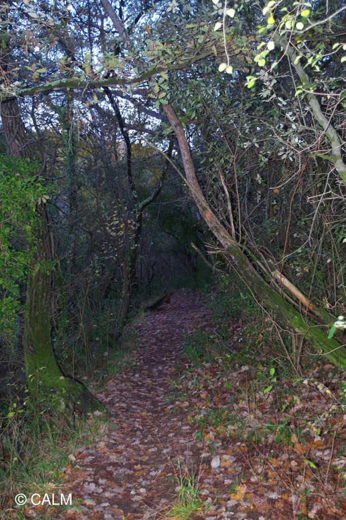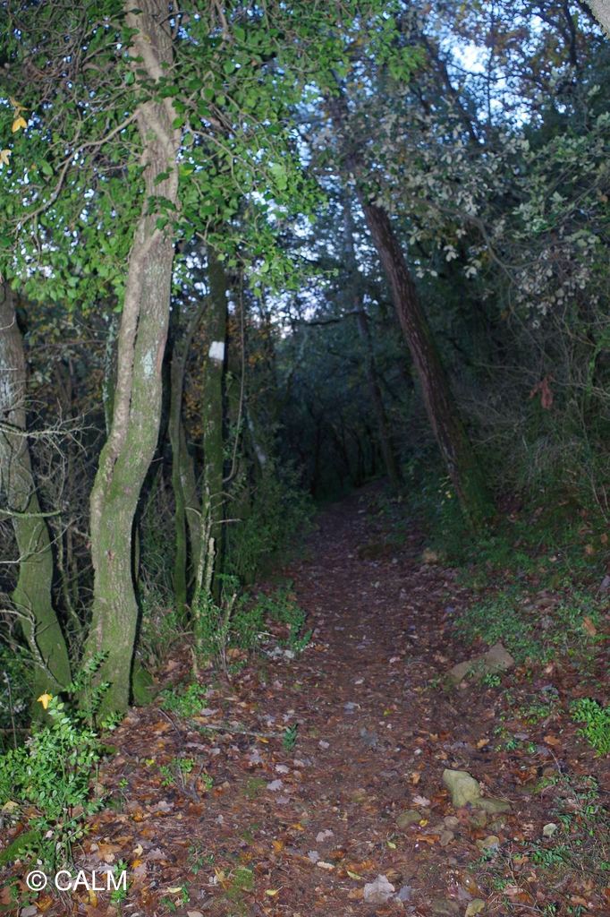 Quelques arbres encombrent le chemin en direction du poteau Grottes aux crânes.