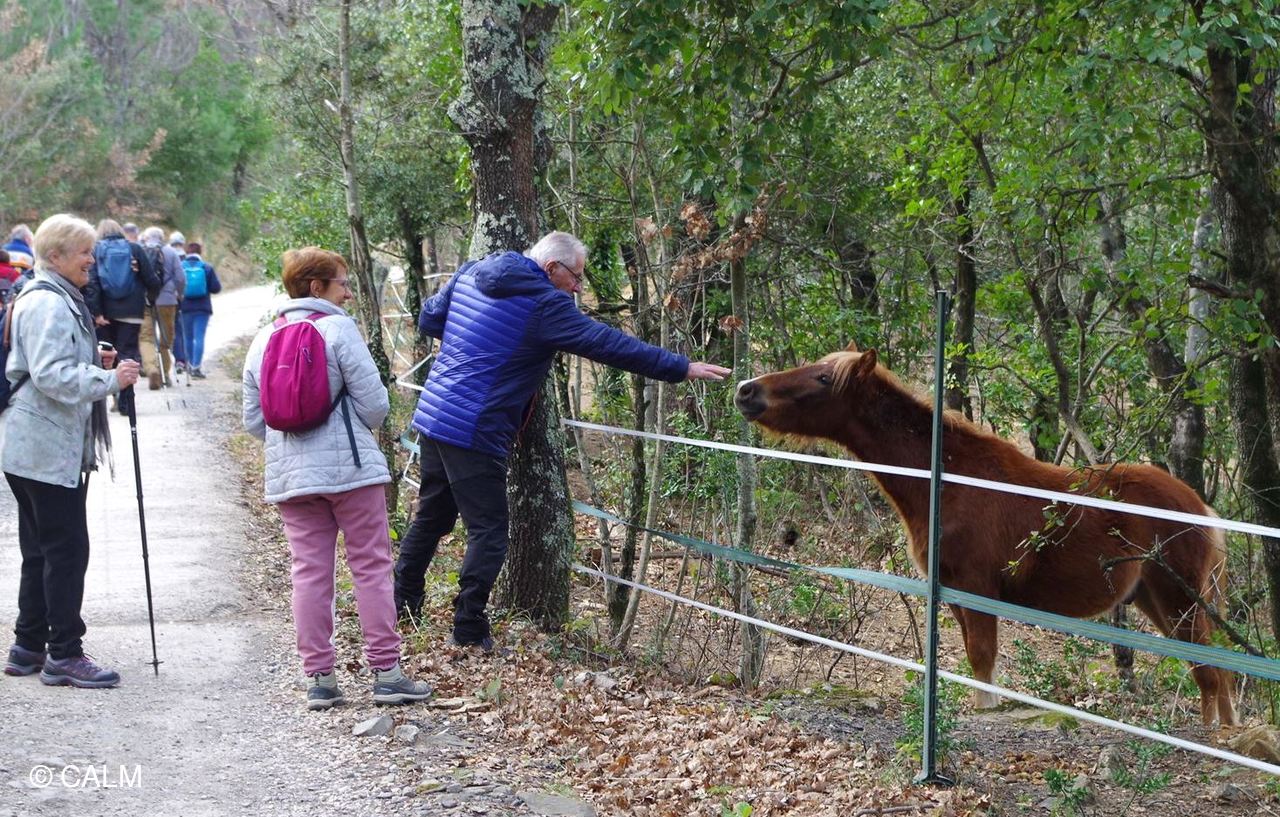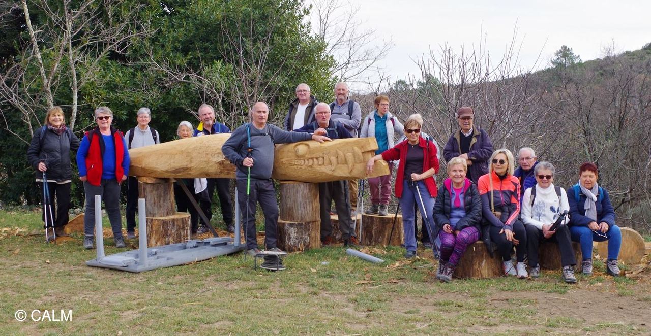 Au départ du chemin des Beaussels, nous attaquons une belle montée, pour arriver en forêt proche du Mas de l'Américain et son tombeau (détails plus tard) ce Mas est de toute beauté et entouré par les écuries des chevaux de Cantaure. Nous resterons un moment pour faire notre photo de groupe près d'une sculpture de crocodile.
