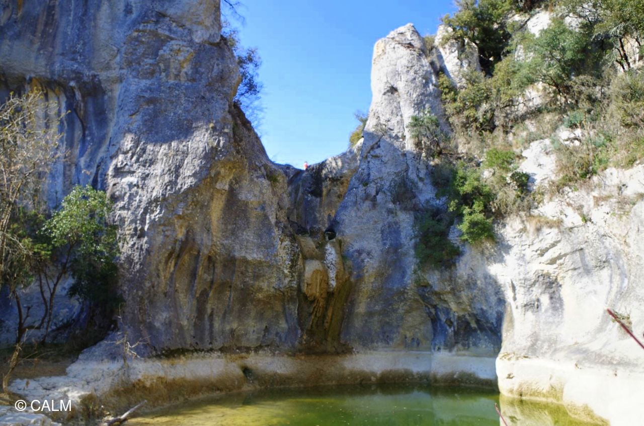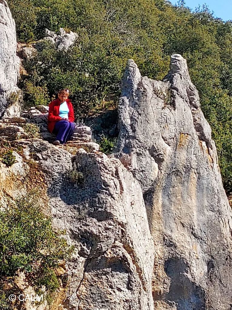 Nous empruntons désormais la voie Royale et traversons un ruisseau à sec pour le moment, nous grimpons un raidillon entre les rochers pour ensuite au Pertus de Fabria arriver au vertigineux point de vue, sur la vallée l'Ibie. Nous prendrons toutes les précautions pour nous approcher au plus près du bord et prendrons le temps d'admirer ce magnifique paysage.