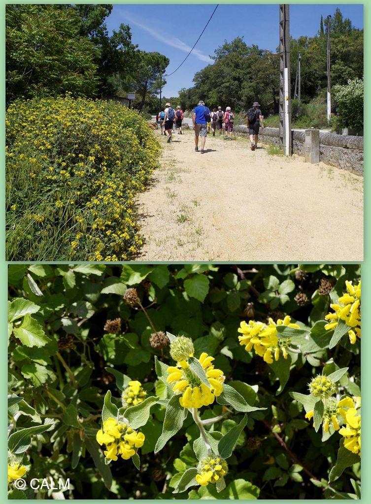 Nous revenons maintenant vers le viaduc du Mas Champion et continuons tout droit vers St. Just par le DFCI longeant la roche, puis à travers champ et enfin une partie périlleuse en bord de route. Voilà, nous arriverons à notre point de départ après 10.500kms en passant près d'arbres dont le parfum est enivrant. Une belle rando ensoleillée.