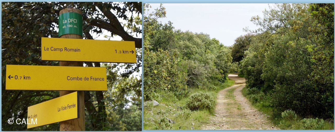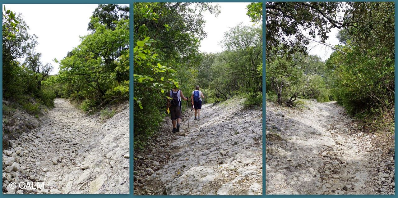 Nous reprendrons notre chemin en direction du DFCI puis couperons le parcours vers la voie ferrée, ici nous marchons de travers sur de la roche ravinée par les pluies.