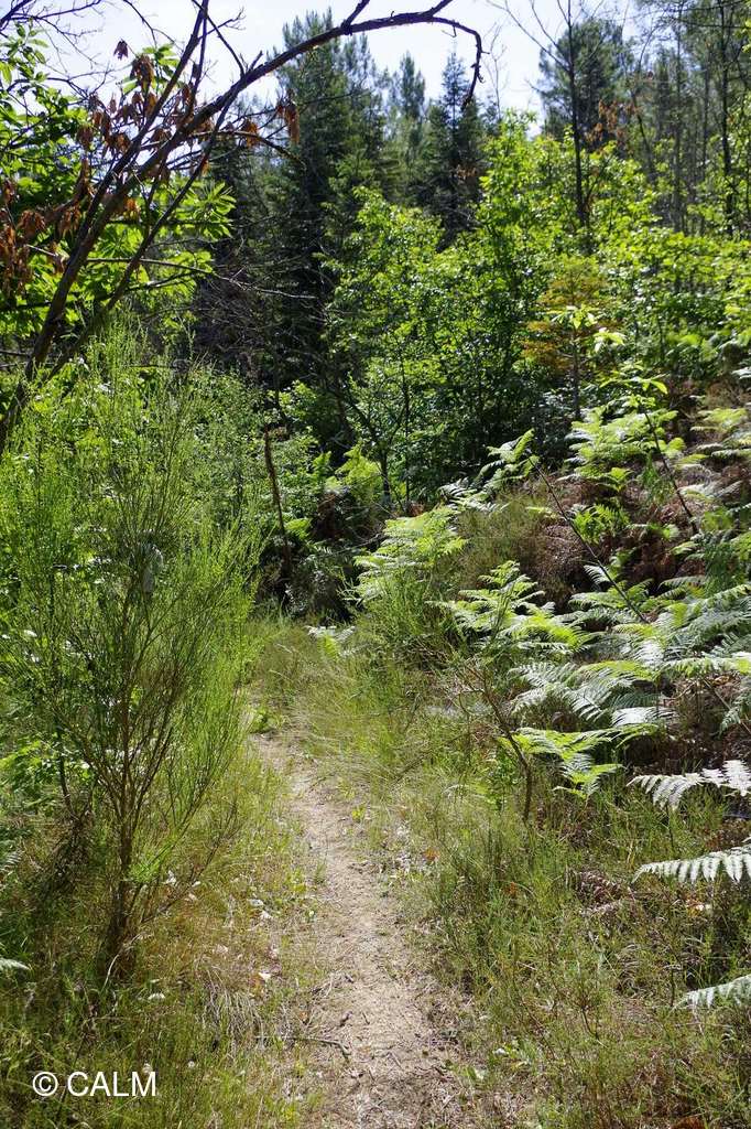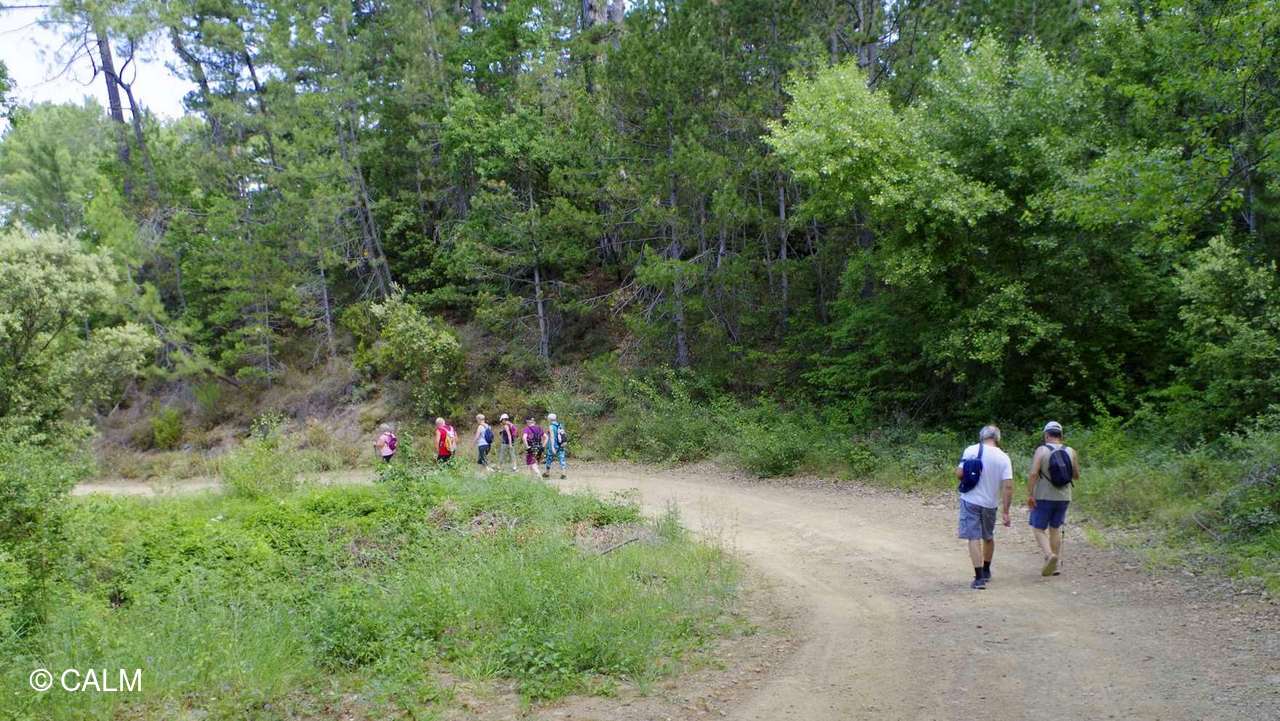 Nous reprenons notre parcours vers le Mas Praden non sans déguster au passage quelques cerises sauvages, et le DFCI se transforme maintenant en un joli petit chemin ombragé, tout autour, les sangliers en recherchent d'eau et de nourriture, ont complètement ravagé les sous bois.
