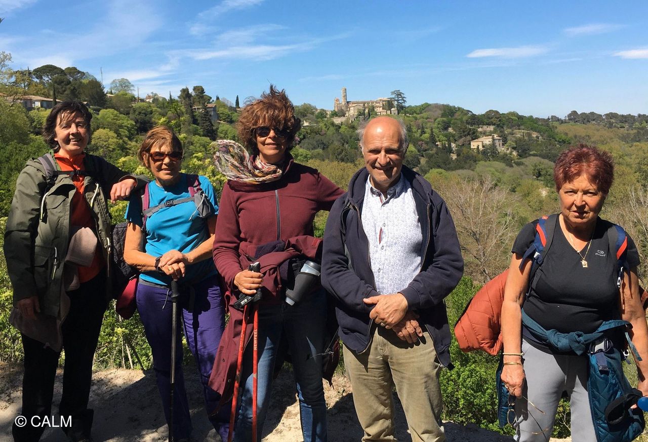 5 marcheurs au départ des arènes d'Uzes dans le cadre de la fête de la rando organisée par la FFR.