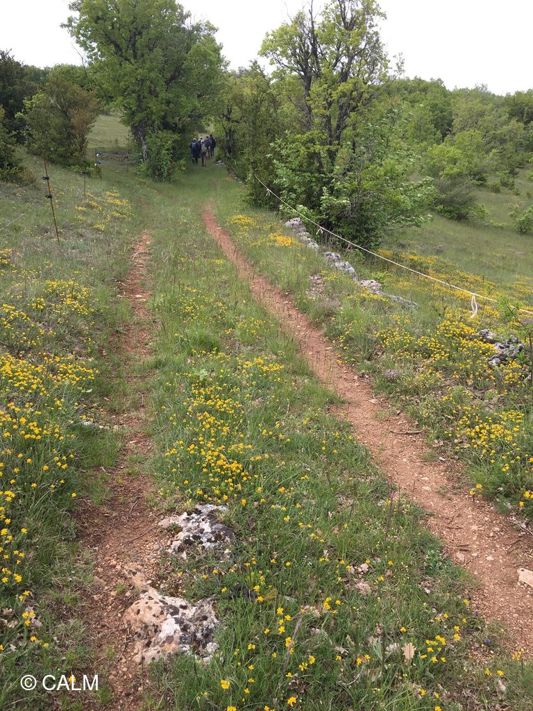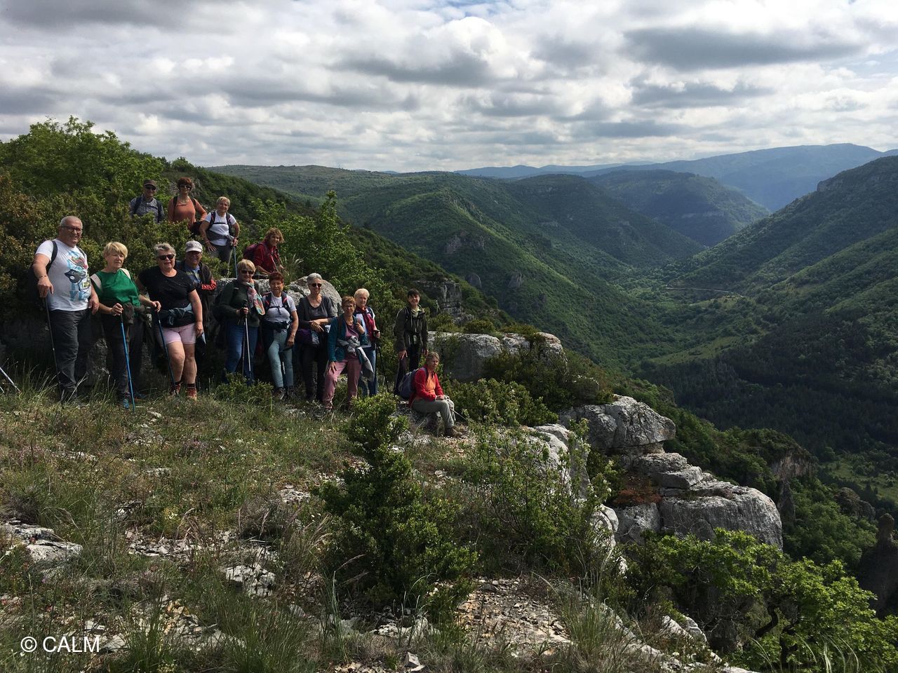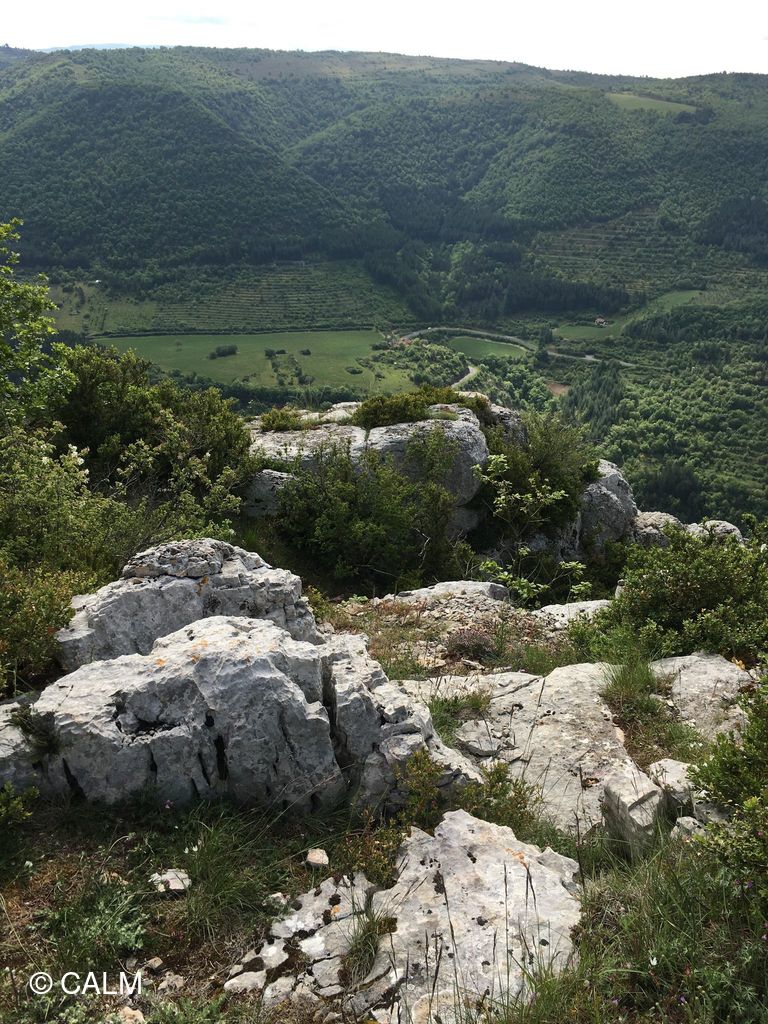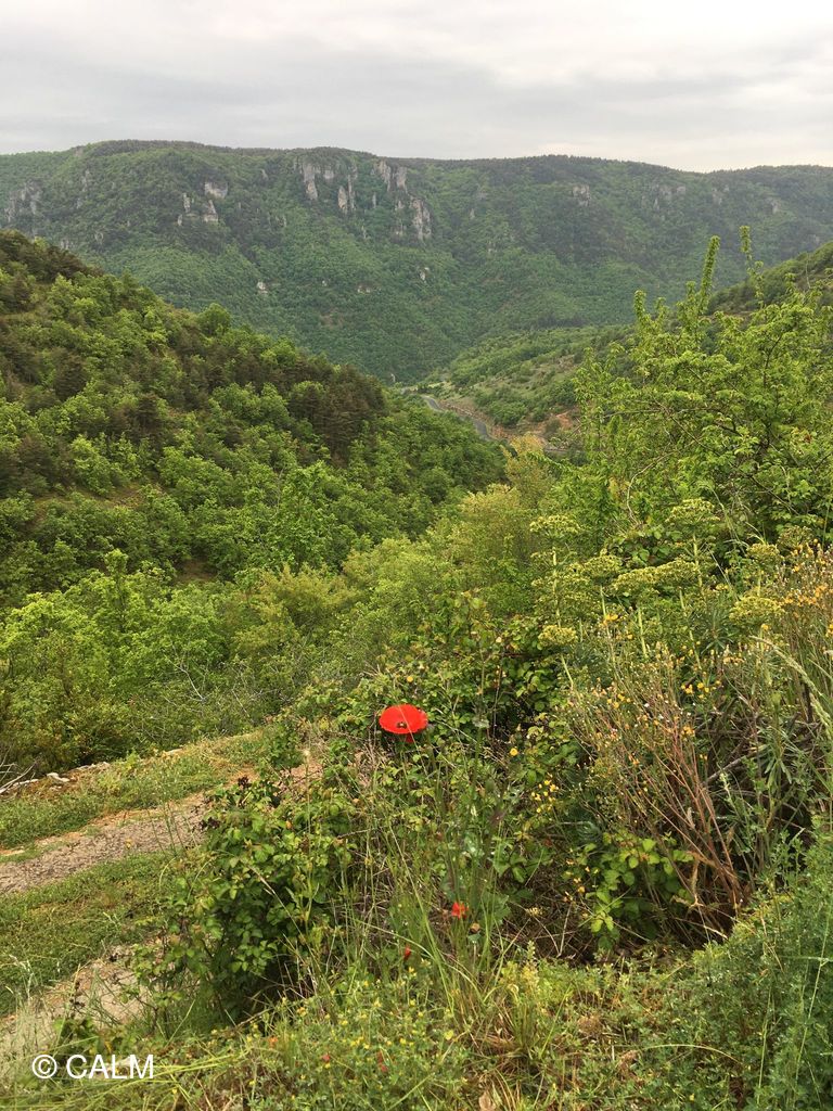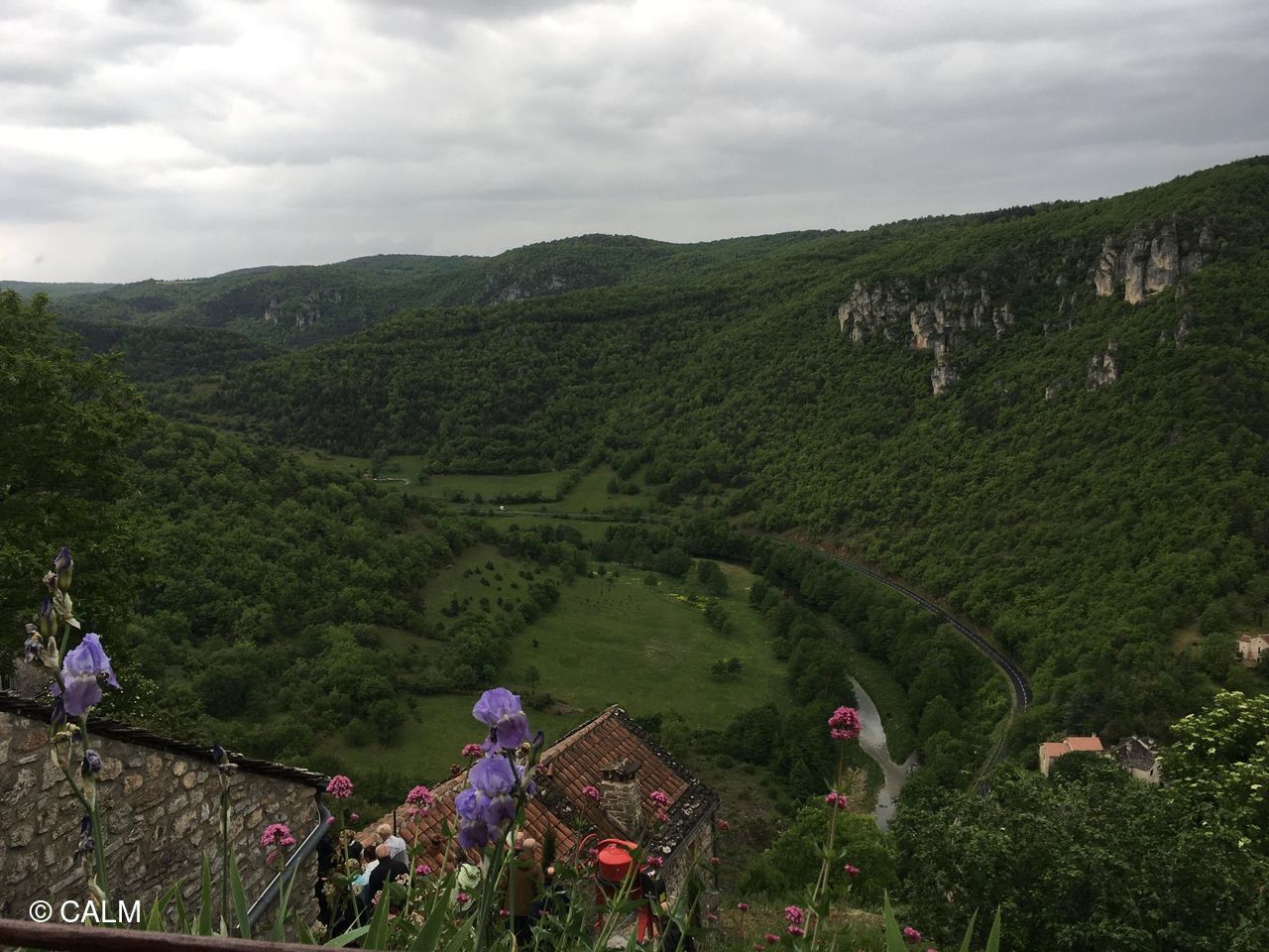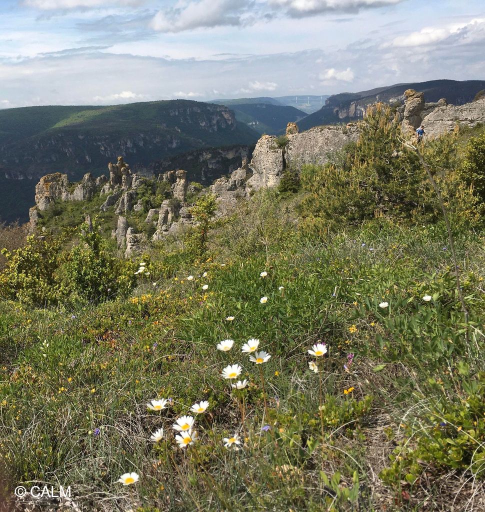 Dernière petite rando facile...Nous devons rentrer tôt car la pluie est annoncée à partir de 15h. Nous montons tranquillement jusqu'au plateau couvert de fleurs et pour seuls arbres des buis. C'est magnifique. Nous nous dirigeons vers le bord du plateau que nous longeons sur un tout petit sentier : à nos pieds les gorges de Trevezel et de l'autre côté de la vallée face à nous le Causse noir. Superbe vue.
