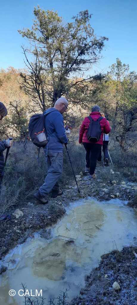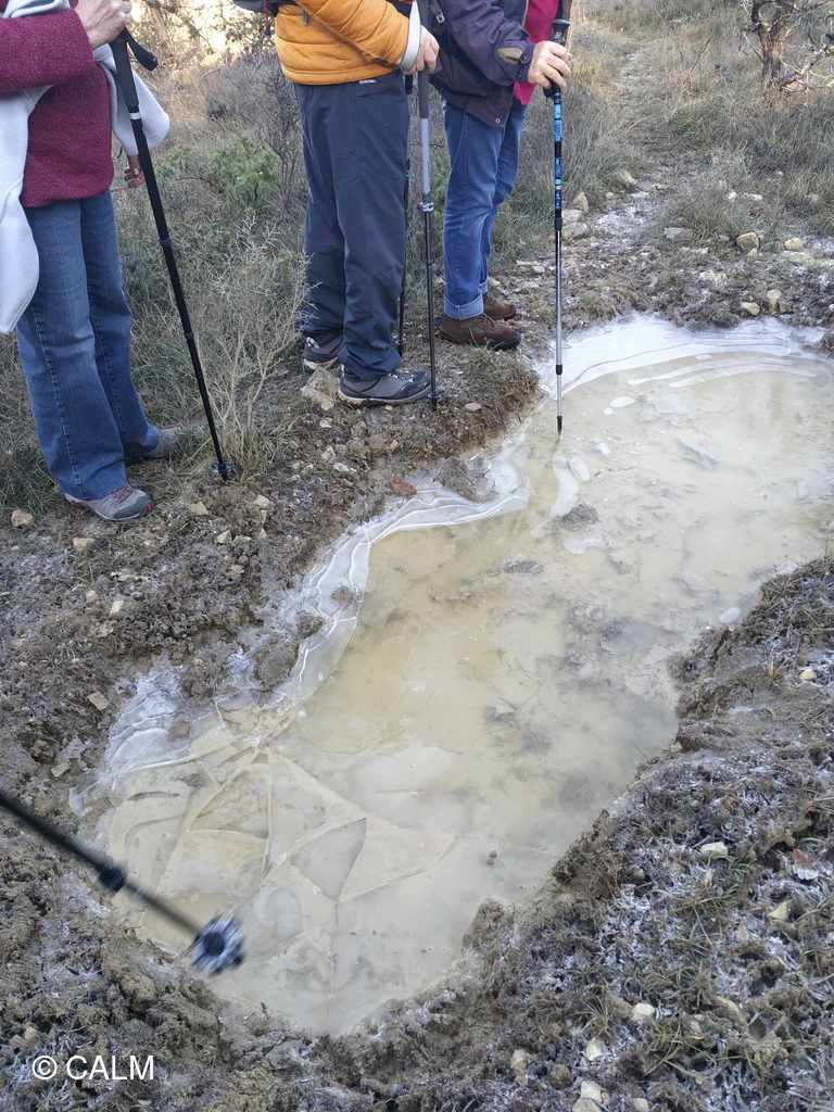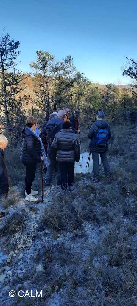 Nous partons par un chemin large puis un sentier givré semé de petites mares gelées pour arriver au hameau de Pierregras, où les constructions nouvelles côtoient les vieilles bâtisses Ardéchoises, nous remontons par un chemin de chasseurs très boueux pour terminer la boucle et revenir au point de départ sur le frontière Gard Ardèche.