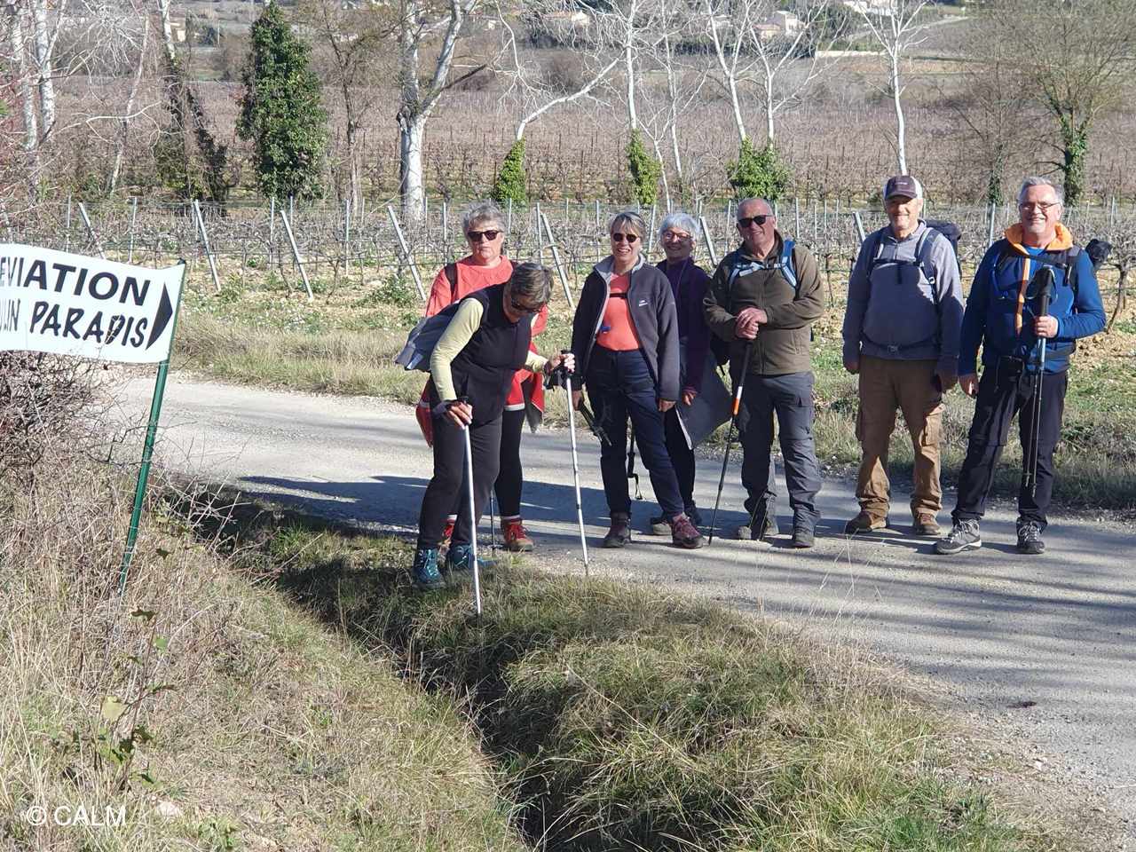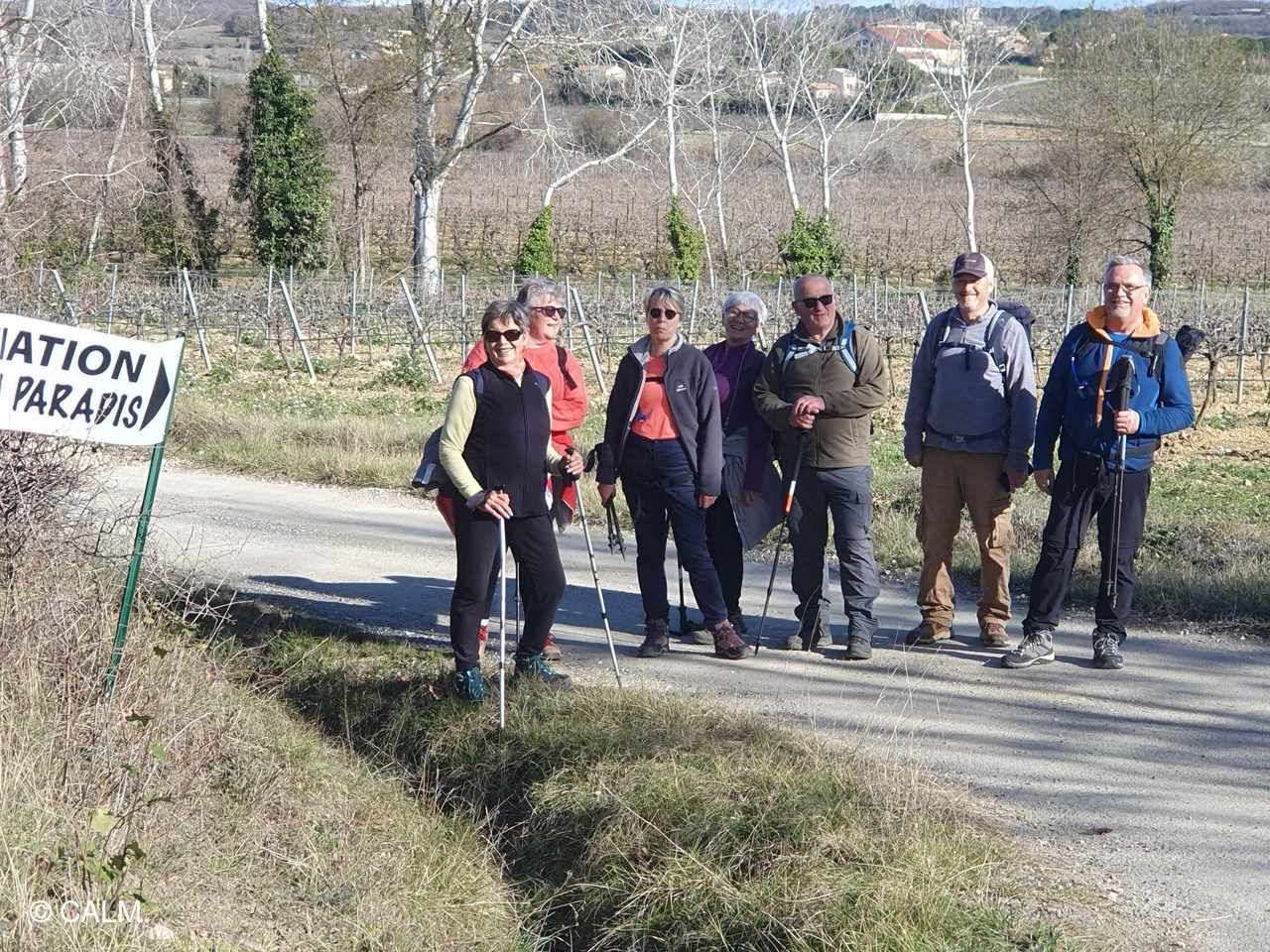 Nous étions 8 randonneurs pour cette balade tranquille d'environ 9km et peu de dénivelé. Un ciel clément nous a permis de voir quelques villages du coin entre gardon et droude. Départ le matin de Cruviers-Lascours pour déambuler dans ces charmantes ruelles . Une grande distillerie du groupe Grap-sud implantée sur 50 hectares trône aux abords du village ;elle traite 35000 tonnes de marc de raisin par an pour obtenir un alcool à plus de 92°. Nous poursuivons notre rando vers Lascours (commune de Cruviers-Lascours) en empruntant une petite route bordée de quelques tombeaux protestants. Après un bon raidillon nous redescendons vers st Césaire de Gauzignan en passant par le moulin à huile d'olive de Portal (Paradis) au bord de la droude. Joli village dont les origines remonteraient au sixième siècle où des moines seraient venus s'implanter . Le village doit son nom à Césaire évêque d'Arles né en 470, il est marqué par l'histoire du protestantisme où nombre de camisards furent condamnés aux galères . Pour la pause repas nous trouvons un coin ensoleillé au bord d'une vigne, puis en route pour le retour à travers les vignobles en sautant allègrement les fossés qui les séparent. Nous faisons une petite pause sur une aire de détente avant de rejoindre les voitures.